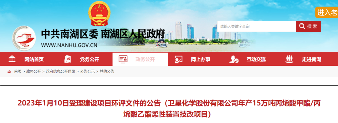 1月10日,卫星化学15万吨丙烯酸甲酯/丙烯酸乙酯柔性装置技改项目进行环评受理。