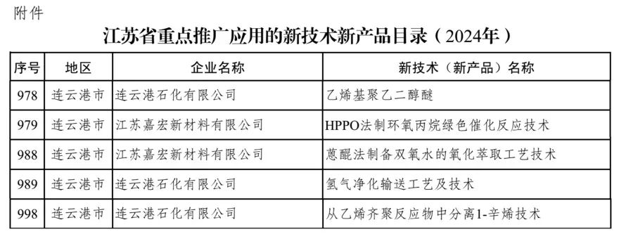 近日,江苏省工业和信息化厅公布了《江苏省重点推广应用的新技术新产品目录(2024年)》,卫星化学旗下连云港石化、嘉宏新材料乙烯基聚乙二醇醚、HPPO法制环氧丙烷绿色催化反应技术等5项新技术凭借创新性、先进性及广阔的市场前景,成功入选该目录。这也是公司首次入选该目录。