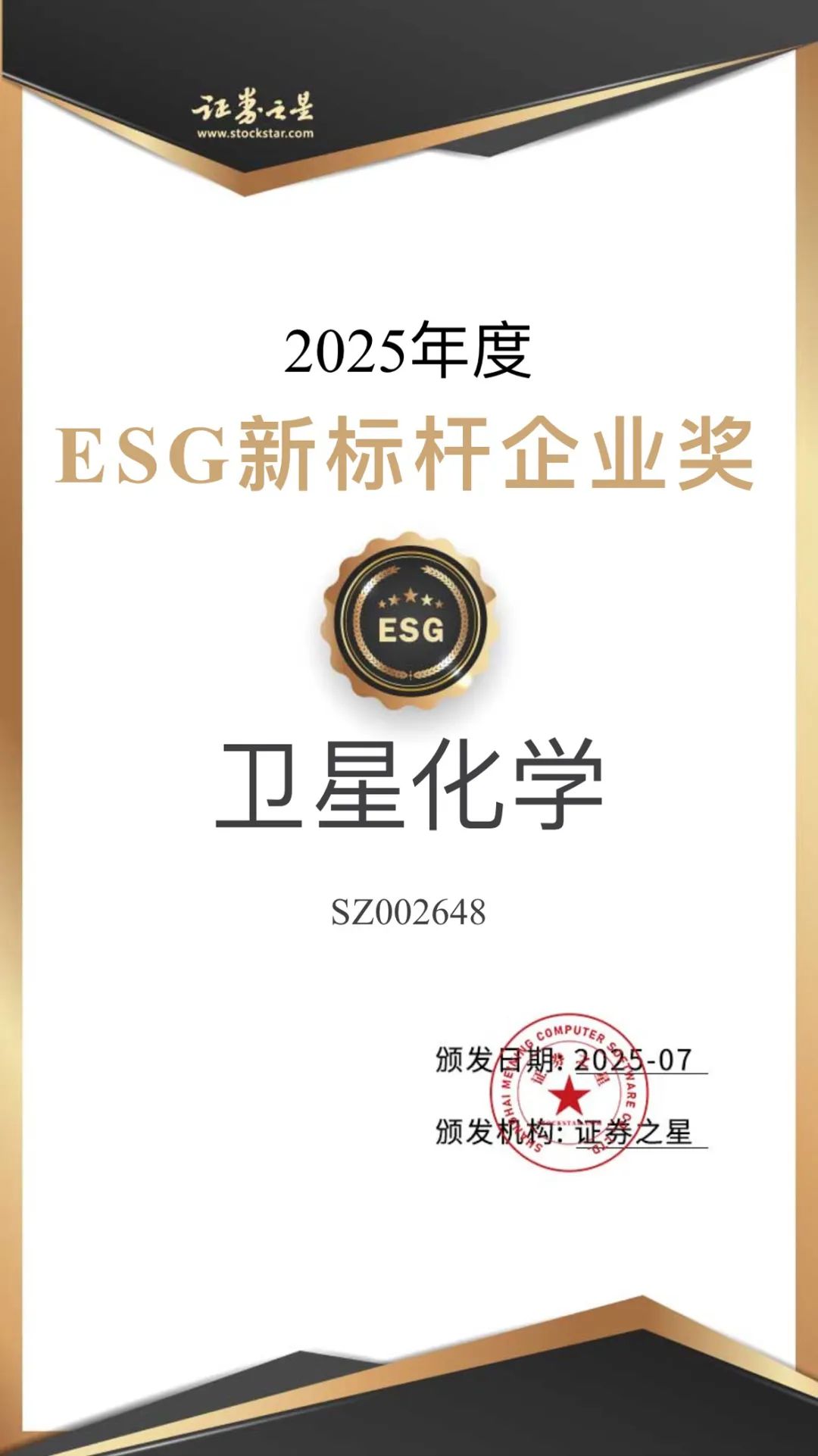 2025年7月25日,卫星化学股份有限公司(002648.SZ)荣获“证券之星 ESG新标杆企业奖”。从“绿碳治理”到“社会共生”,从“战略统筹”到“科技担当”,卫星化学以高质量可持续实践走出了一条穿越周期、向善向上、绿色领先的发展之路。