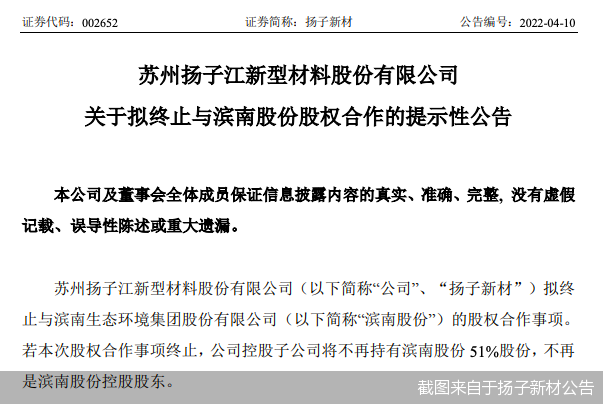 2022年4月20日,扬子新材收到滨南股份转让方出具的《沟通函》,由于公司至今尚有9281.64万元股份转让款未付清,逾期付款情形已触发《股份转让协议》中第9.2条协议解除约定,对方提出拟终止本次股权合作。