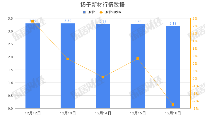 截至12月18日,扬子新材(002652.SZ)股价收盘报3.28元,跌2.74%,总市值16.33亿元。