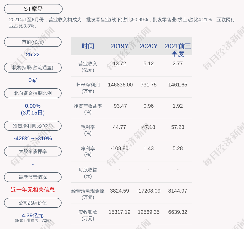 2021年1至6月份,ST摩登的营业收入构成为:批发零售业(线下)占比90.99%,批发零售业(线上)占比4.21%,互联网行业占比3.3%。