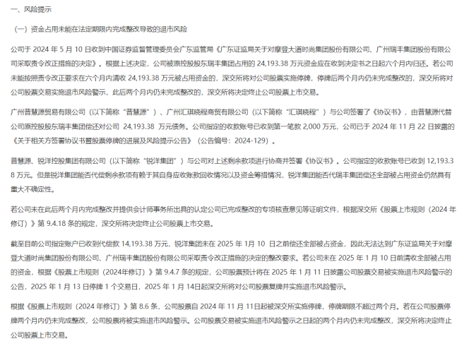 自2024年以来,*ST摩登便处于风雨飘摇之中。据公告显示,公司原控股股东瑞丰集团占用的资金高达2.42亿元,直至目前仍有1亿元未能完成清收。这笔巨额资金的未归还不仅影响了公司的正常运营,也直接导致了公司股票被停牌。