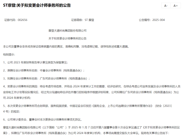 更加引人关注的是,在面临退市风险的情况下,*ST摩登突然宣布更换其会计师事务所,新任的广东司农会计师事务所(特殊普通合伙)将负责公司2024年度的审计工作。