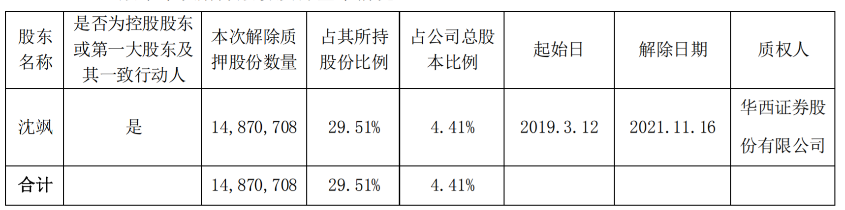 公告显示,到中科金财控股股东沈飒将其所持有的中科金财1487.07万股份解除质押,占中科金财总股本比例为4.41%。