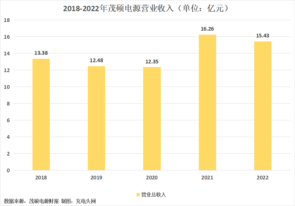根据茂硕电源报告数据显示,2018-2022年,茂硕电源营业收入分别为13.38亿元、12.48亿元、12.35亿元、16.26亿元、15.43亿元,同比增长-19.02%、-6.72%、-1.03%、31.65%和-5.08%。