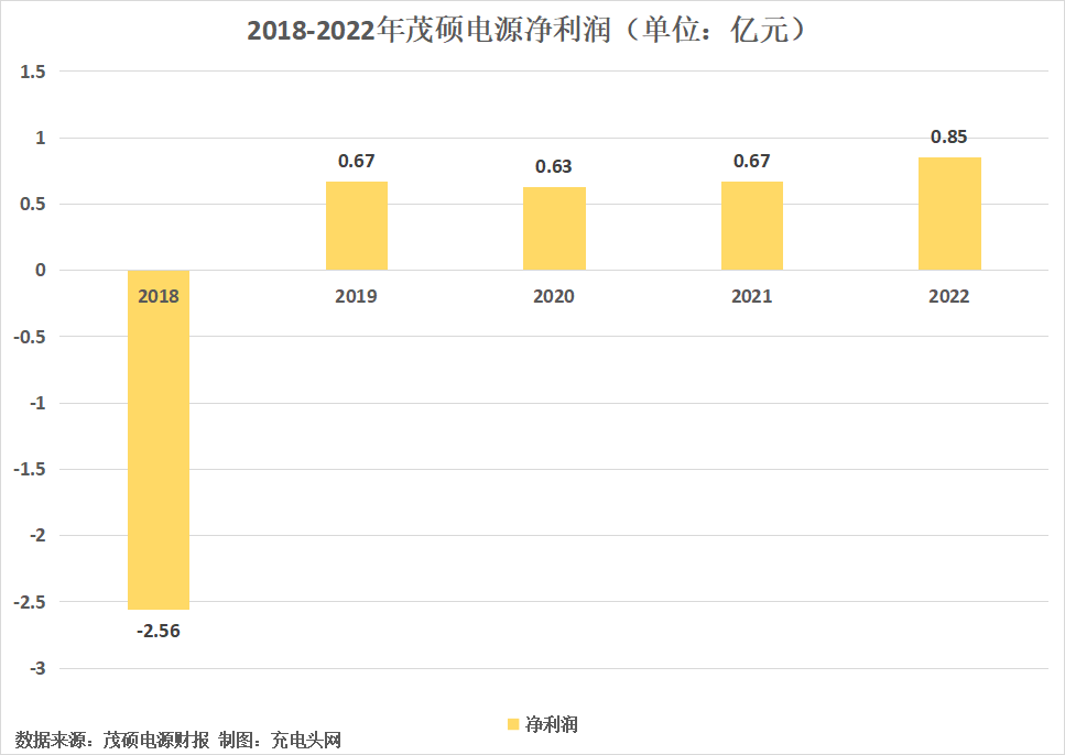 2018—2022年,茂硕电源净利润分别为-2.56亿元、0.67亿元、0.63亿元、0.67亿元、0.85亿元,同比增长-2057.60%、126.01%、-5.50%、5.82%和27.70%。