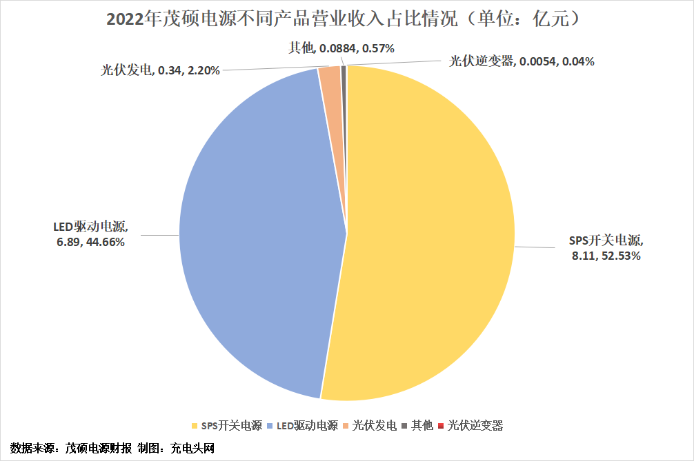 分产品看:2022年,茂硕电源SPS开关电源营业收入8.11亿元,营收占比52.53%;LED驱动电源营业收入6.89亿元,营收占比44.66%;光伏发电营业收入0.34亿元,营收占比2.20%;光伏逆变器营业收入0.0054亿元,营收占比0.04%;其他营业收入0.0884亿元,营收占比0.57%。