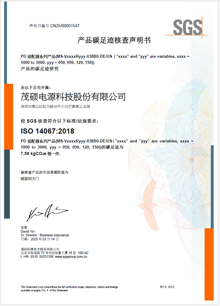 近日,茂硕电源科技股份有限公司(简称:茂硕电源,股票代码:002660)自主研发的一款PD适配器系列产品(MS-VxxxxRyyy-038B0-DE/US)成功通过ISO 14067:2018国际碳足迹认证,成为电源行业绿色制造的标杆案例。该认证由国际第三方认证机构SGS严格核查,确认单台产品碳足迹为7.58kgCO?e,标志着茂硕电源在全生命周期碳排放管理领域迈出坚实一步,为全球客户的绿色采购提供了可量化依据。