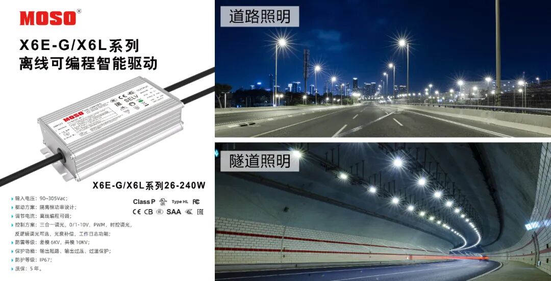 · X6E-G 系列以高转换效率、宽电压适应范围及优异的防雷抗干扰性能,适配各类复杂道路照明场景;X6L 系列主打小型化、轻量化设计,满足紧凑型灯具安装需求。
