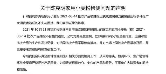 2021年12月31日,深圳市市场监督管理局发布2021年食品安全抽样检验情况通报(第三十六期)显示,克明食品(002661)的全资子公司遂平克明面粉有限公司生产的陈克明家用小麦粉脱氧雪腐镰刀菌烯醇超标。1月6日,克明食品在微信公众号发布声明称:超标产品属偶发性事件,已全部召回。