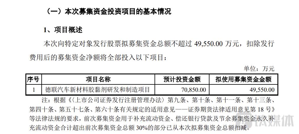同时,钛媒体 APP 注意到,公司在宣布此次定增之前,曾撤回过一次再融资申请,公司原计划募集 4.96 亿元建设德联汽车新材料胶黏剂研发和制造项目(即项目一)。有意思的是,该定增计划在遭深交所问询之后便宣布终止。