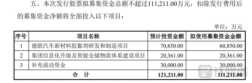 因此,德联集团拟通过本次募集资金投资项目的实施,扩大企业营收规模,增强企业的盈利能力。具体来看,公司此次募集资金不超过 11.12 亿元,其中 6.09 亿元用于德联汽车新材料胶黏剂研发和制造项目(下称项目一)、2.04 亿元用于集团信息化升级及智能仓储物流体系建设项目(下称项目二)、3 亿元用于补流。