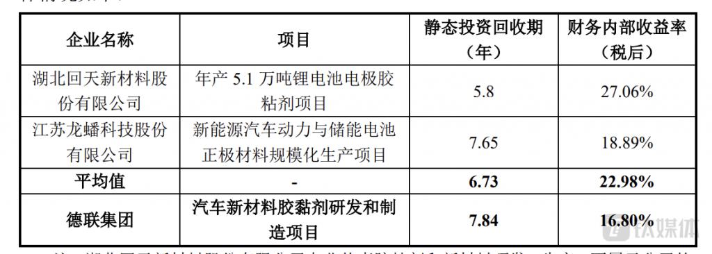 不到两个月时间,定增计划便卷土重来(即本次 11.12 亿元定增)。对比两次定增来看,项目一被保留,但募投金额由 4.96 亿元增加至 6.09 亿元,增加了 1.13 亿元。另外,德联集团在测算项目经济效益情况时表示,项目一的内部收益率为 16.80%,低于同行业可比项目平均值 22.98%。