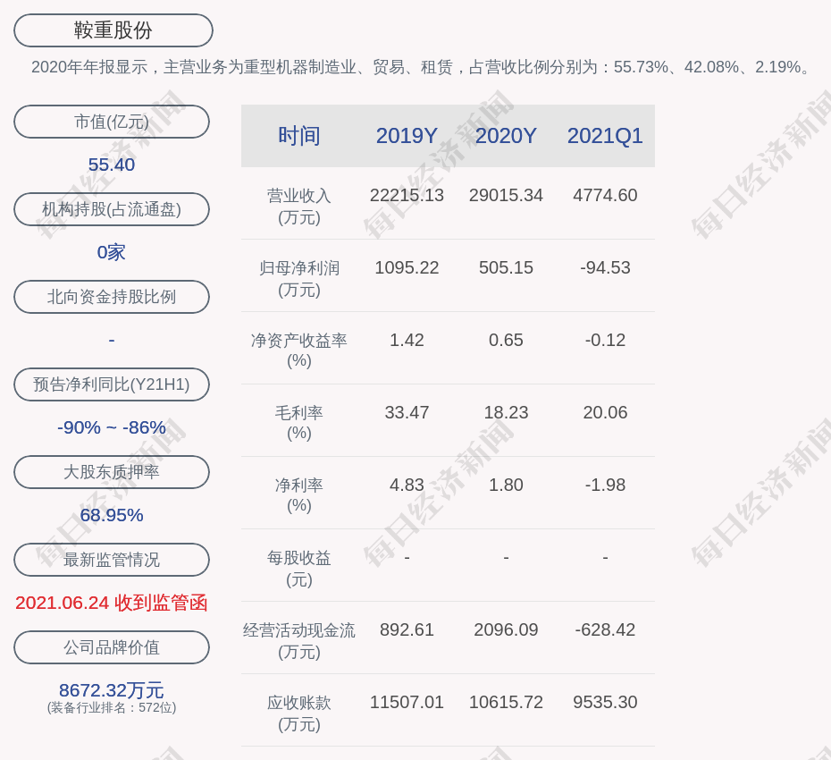 2020年年报显示,鞍重股份的主营业务为重型机器制造业、贸易、租赁,占营收比例分别为:55.73%、42.08%、2.19%。