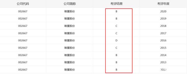 据投研电讯信披质量研究院统计,自2012年在深交所上市以来,鞍重股份在深交所9次年度信息披露考评中,5次为B,3次为C,1次为D,从未获A。