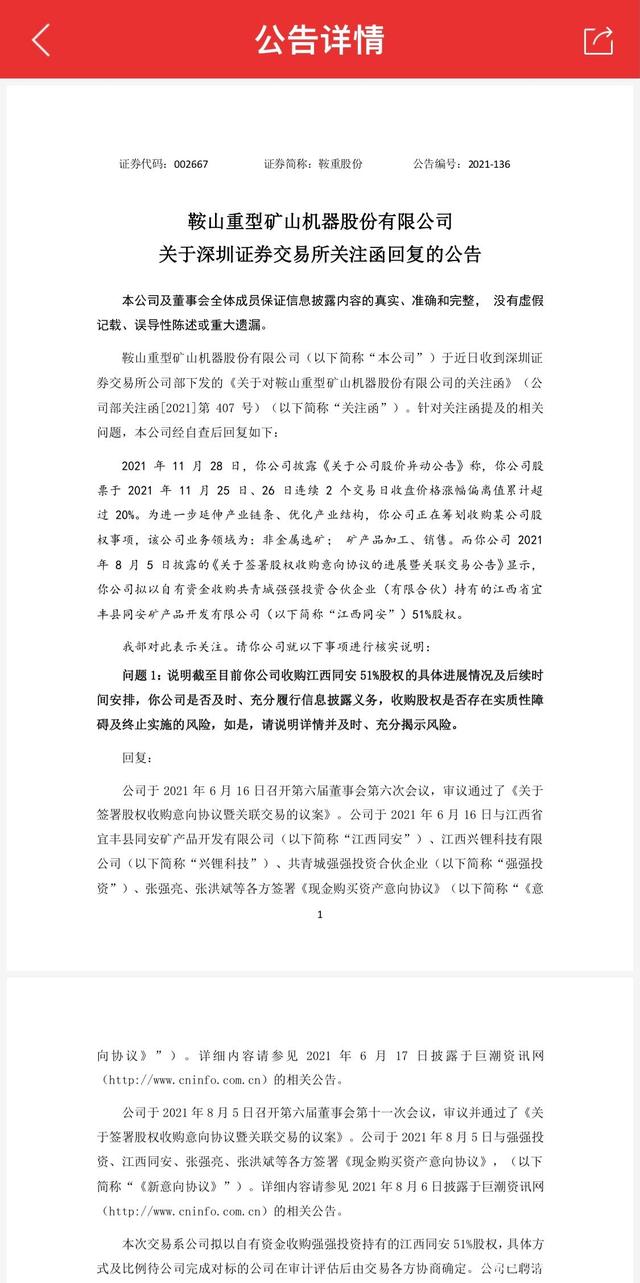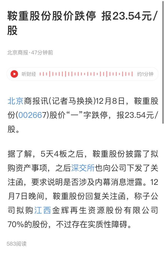 这次11月22号后又是五天四涨停,后鞍重股份披露了拟购资产事项,因为又是先知先觉,所以再次要求说明是否存在内幕消息泄漏,公司自查,当然不会承认自己做了那事,但股票这次不同步了,就在回复了关注函后的今天,开盘一字跌停,说明资金心虚了。
