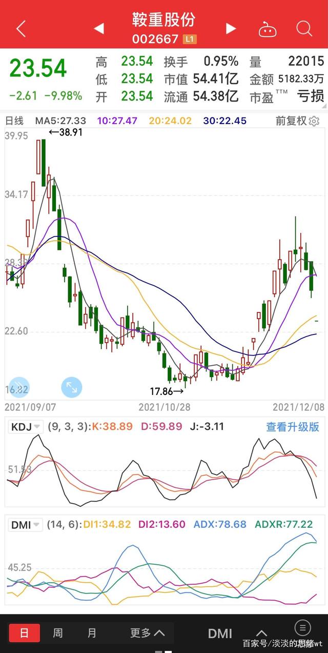因重组,鞍重股份这只亏损股从今年的5.8涨到过39,稳稳的六倍收益,在调整了一段时间后,股价还在23.54元,但可能又是消息提前泄漏,因为重组存在实质性障碍,所以主力提前跑路了,昨天前天都是大跌6个点以上。这种被各方质疑的股票千万谨慎!股价已经在高位了如果重组成功,就缓缓下跌,如果失败就一字跌停到启动价。