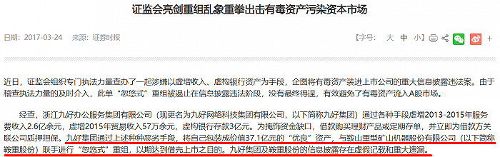 证监会官网2017年《证监会亮剑重组乱象重拳出击有毒资产污染资本市场》一文显示,九好集团通过将自己包装成价值37.1亿元的“优良”资产,与鞍重股份联手进行“忽悠式”重组,以期达到借壳上市之目的。九好集团及鞍重股份的信息披露存在虚假记载和重大遗漏。