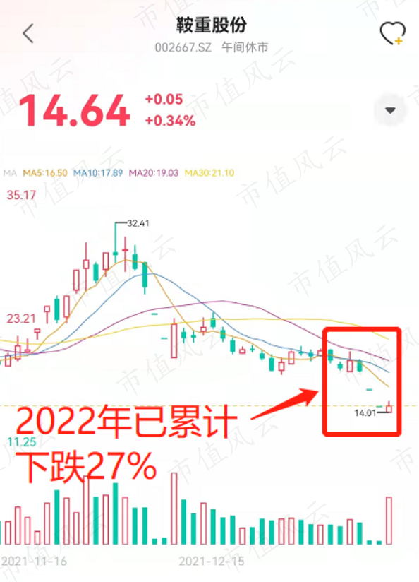 从2022年1月10日至11日,鞍重股份的股价出现连续一字跌停板,2022年至今已下跌超27%,让2万多名中小股东刚刚告别难熬的2021年,就马上品尝到2022年关灯吃面的苦。