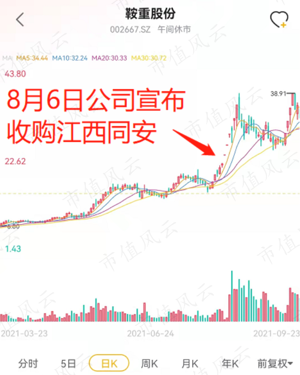 其中,在8月6日公司宣布拟收购江西同安的消息引爆股价,随后6个交易日出现5个涨停板。