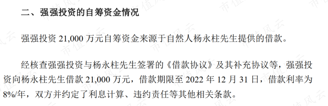 而根据回复函显示,强强投资接盘的2.6亿元中,有2.1亿元来自于杨永柱的借款。