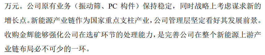 2021年12月中旬,鞍重股份披露拟通过全资子公司宜春友锂以自有资金共2.31亿元收购金辉再生70%股份。彼时公司称,收购金辉再生能够强化公司在选矿环节的处理能力,是完善公司在整个新能源上游产业链布局必不可少的一环。