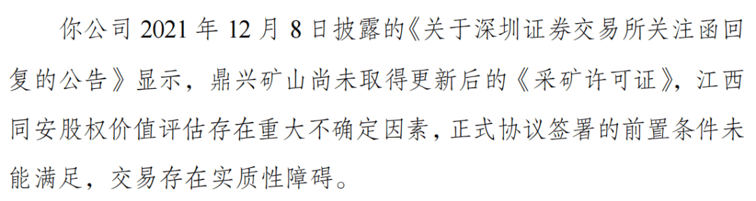 据此,交易所关注函要求公司说明本次交易终止的具体原因,导致本次交易发生重大变化的具体时点,公司及任一董事、监事、高级管理人员知悉或理应知悉本次交易终止的具体时点,在2021年8月10日鼎兴矿山未能取得更新后的《采矿许可证》及2021年12月8日公司认为交易存在实质性障碍的情况下,公司迟至2022年1月8日才签署《终止协议》的原因及合理性。