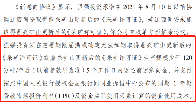 彼时,强强投资承诺在2021年8月10日以前协调江西同安取得鼎兴矿山更新后的《采矿许可证》,若未能取得《采矿许可证》,鞍重股份有权单方面解除协议,要求强强投资退还5800万元订金,并按约定支付资金利息。