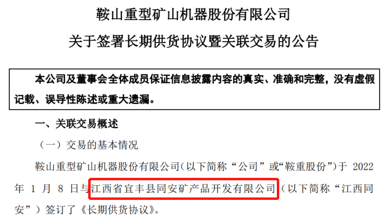 鞍重股份准备的预案就是签署长期供货协议。1月9日晚,鞍重股份发布公告拟向江西同安订购含锂原矿石(品位区间0.3%-0.5%),采购年度总量不低于60万吨,月度供量不低于5万吨,采购单价为市场价。