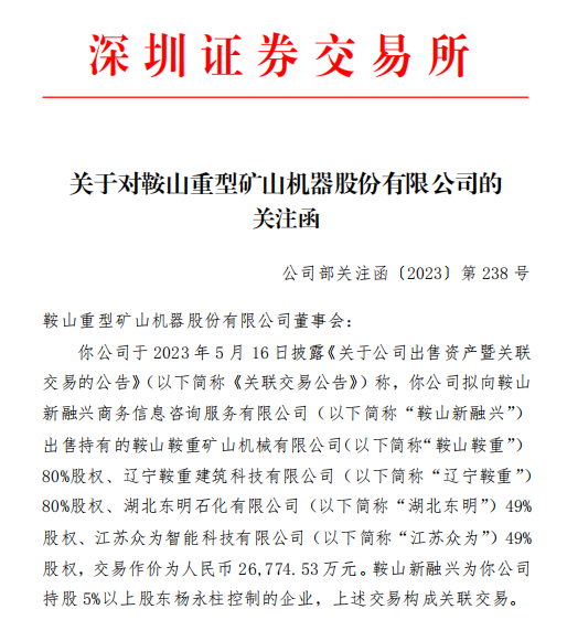 前后间隔不到两个月时间,鞍重股份因转让重型机械资产包再获深交所关注函。