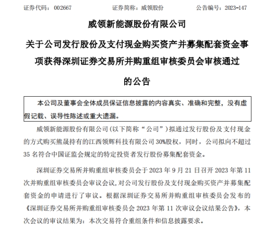 威领股份(002667.SZ)昨日晚间披露了《关于公司发行股份及支付现金购买资产并募集配套资金事项获得深圳证券交易所并购重组审核委员会审核通过的公告》。深交所并购重组审核委员会于2023年9月21日召开2023年第11次并购重组审核委员会审议会议,对公司发行股份及支付现金购买资产并募集配套资金的申请进行了审议。根据深交所并购重组审核委员会发布的《深圳证券交易所并购重组审核委员会2023年第11次审议会议结果公告》,本次会议的审议结果为:本次交易符合重组条件和信息披露要求。