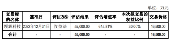 根据中瑞评估师出具的《评估报告》,以2022年12月31日为评估基准日,本次交易的标的资产的评估值为55,000.00万元,较基准日账面净资产增值47,625.42万元,增值率645.81%。经公司及交易对方友好协商,确定领辉科技30%股权的交易作价为16,500.00万元。