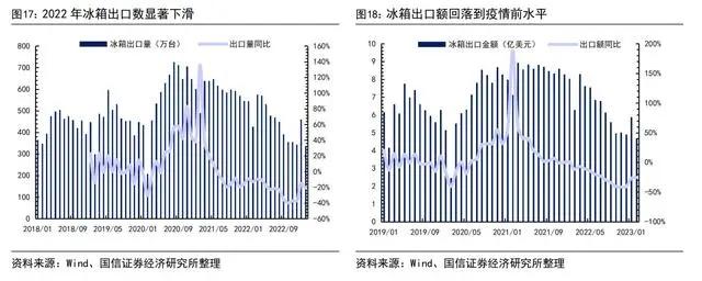 在疫情扰动、海外需求不振和高库存的三重负向共振影响下,2022 年国内冰箱出口显著下滑,2023 年以来降幅已明显收窄。