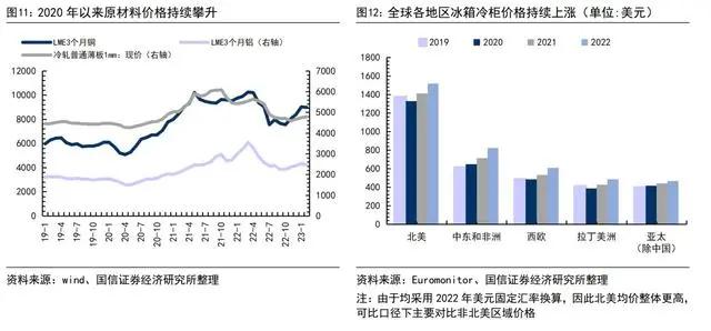 结构性升级下海外市场冰箱价格持续提升。2020 年以来大宗原材料价格和海运价格持续攀升,全球通胀压力下冰箱均价上涨,2021 年北美、西欧、亚太(除中国)拉丁美洲、中东和非洲冰箱冷柜价格同比+6.13%、+9.56%、+6.34%、+9.99%、+10.27%。
