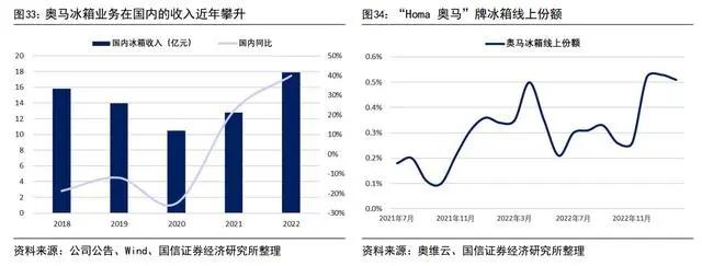 内销方面,OBM+ODM 双轮驱动策略。2022 年公司境内收入 18.93 亿,同比增长+43%。公司在境内生产和销售自主品牌“Homa 奥马”牌冰箱和冷柜,并为战略客户提供 ODM 服务。随着国内的渠道和品牌力逐步树立,在强产品能力的支撑和大股东 TCL 的协同下,内销份额提升可期。