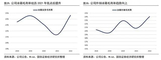 公司近年持续推动大容积风冷产品占比的提升,2022 年冰箱销售中高端风冷产品销量占比 35.7%,销量同比提升 5.9%;收入占比 56.3%,同比提升 8.6%。同时在原材料价格压力降低的背景下,公司冰箱业务毛利率 2022 年同比提升 3.2pct 至 24.6%。