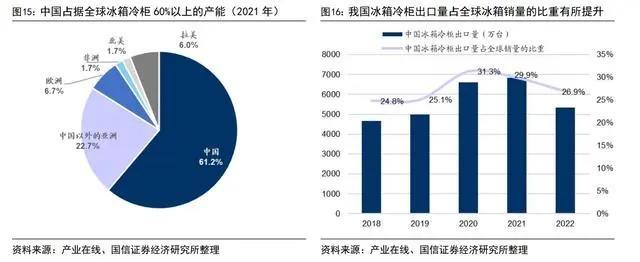 我国是全球最大的冰箱冷柜生产国,占全球产量的 54%,2022 年出口冰箱冷柜超 5000 万台。经过多年的发展,我国已拥有全球最大的冰箱冷柜产能,根据产业在线的数据,2021 年全球冰箱冷柜产能约 3 亿台,中国占比超过 60%,共有 1.82 亿台产能。