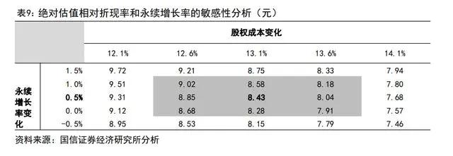 该绝对估值相对于股权成本和永续增长率较为敏感,下表为敏感性分析。