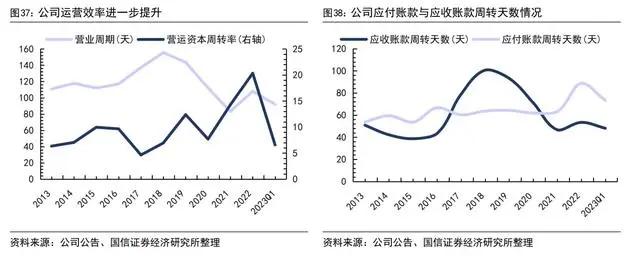 2022 年公司营业周期为 108 天,虽然同比 2021 年+25 天,但是仍然处于历史低位。公司营运资本周转率显著提高,2022 年为 20.43%/+6.06pct,具体来看,公司应收应付账款的周转天数都在抬升,但是应付账款周转天数抬升幅度更大,两者之间的缺口进一步扩大表明公司在产业链中的话语权进一步提高。