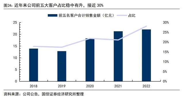 当前公司已成功进入多家国际知名冰箱龙头企业的全球采购系统,为全球 130 多个国家和地区超 2000 多合作伙伴提供优质产品,与全球 250 多个知名品牌、零售渠道及进口商建立了长期友好的战略合作关系,公司成熟的客户服务体系也进一步增强了客户粘性,近年前五大客户占总销售额比重稳中提升,2022 年达到 28.1%