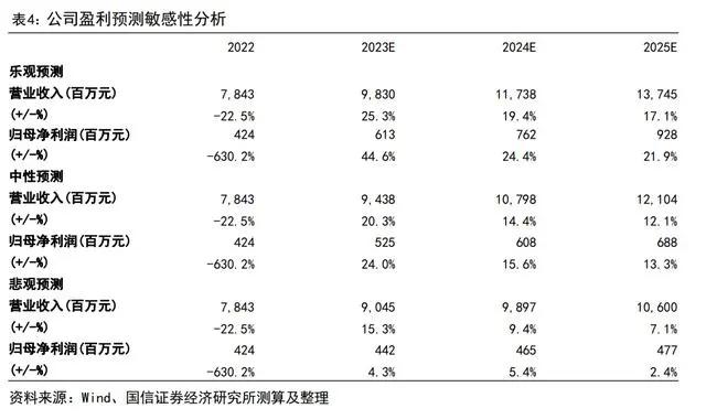 假设在乐观、中性、谨慎情况下,2023-2025 年的收入增速分别围绕中性情况波动±5%,毛利率围绕中性情况波动±0.5pct,则在乐观情况下,公司 2023-2025 年归母净利润预计同比增长 45%、24%、22%;谨慎情况下,公司未来三年归母净利润同比增长 4%、5%、2%。