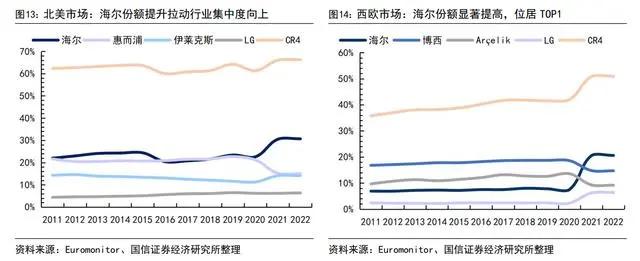 海尔凭借全球及高端化布局,疫情期间在海外销量逆势增长,份额大幅提升,2022 年在北美/西欧市场份额分别为 30.7%/20.6%,相比 2020 年提升了 8.1pct/13.1pct。其他头部品牌份额亦整体稳定,2022 年北美/西欧市场 CR4 分别为 66.30%/50.91%
