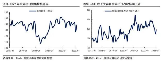 从结构上看,尽管需求不振,但价格依然相对坚挺,一方面是原材料提升之后的传导,另一方面也和产品升级的支撑有关,500L 以上大冰箱的出口比例在疫情高峰过后,依然保持了较高的水平。