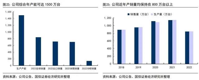 公司近年来亦持续升级自动化设备与生产线,驱动精益生产、打造高端智能工厂,280 万台高端冰箱智能制造项目正按计划建设,预计在 2023 年和 2024 年分阶段建成投产,将进一步提升公司产能和生产制造优势。