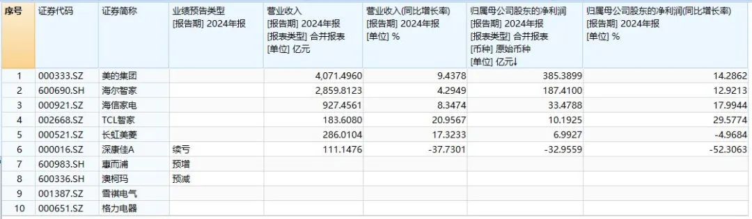 依据申万行业分类标准,A股现有10家白色家电公司。截至发稿,6家已公告2024年年报,2家发布业绩预告,仅格力电器、雪祺电气尚未披露2024年业绩相关信息。