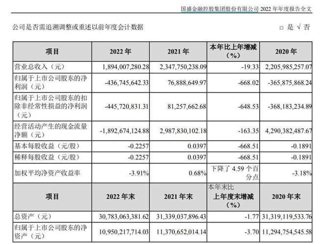 4月10日电国盛金控日前披露2022年年报显示,全年实现营业收入18.94亿元,同比下降19.33%;归属于上市公司股东的净利润亏损4.37亿元,上年同期盈利7688.86万元,同比下降668.02%;基本每股收益-0.23元;平均净资产收益率为-3.91%。