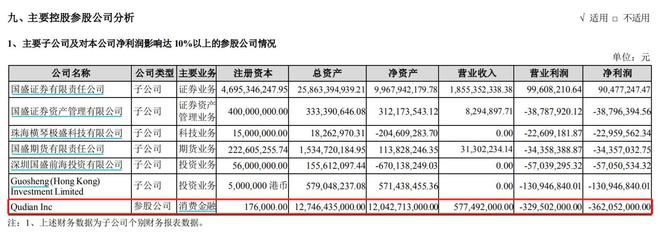 其中,国盛资管亏损0.39亿元,极盛科技亏损-0.23亿元,国盛期货亏损0.34亿元,国盛前海投资亏损0.57亿元,国盛香港亏损1.31亿元,趣店亏损3.62亿元。