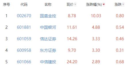 其中,国盛金控、中国银河、信达证券、东方证券、中信建投位列板块涨幅前五位,涨幅分别为10.03%、4.88%、3.33%、3.30%、2.89%。