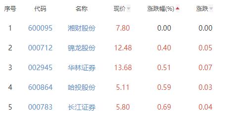 湘财股份、锦龙股份、华林证券、哈投股份、长江证券位列涨幅榜后五位,涨幅分别为0.00%、0.40%、0.51%、0.59%、0.69%。